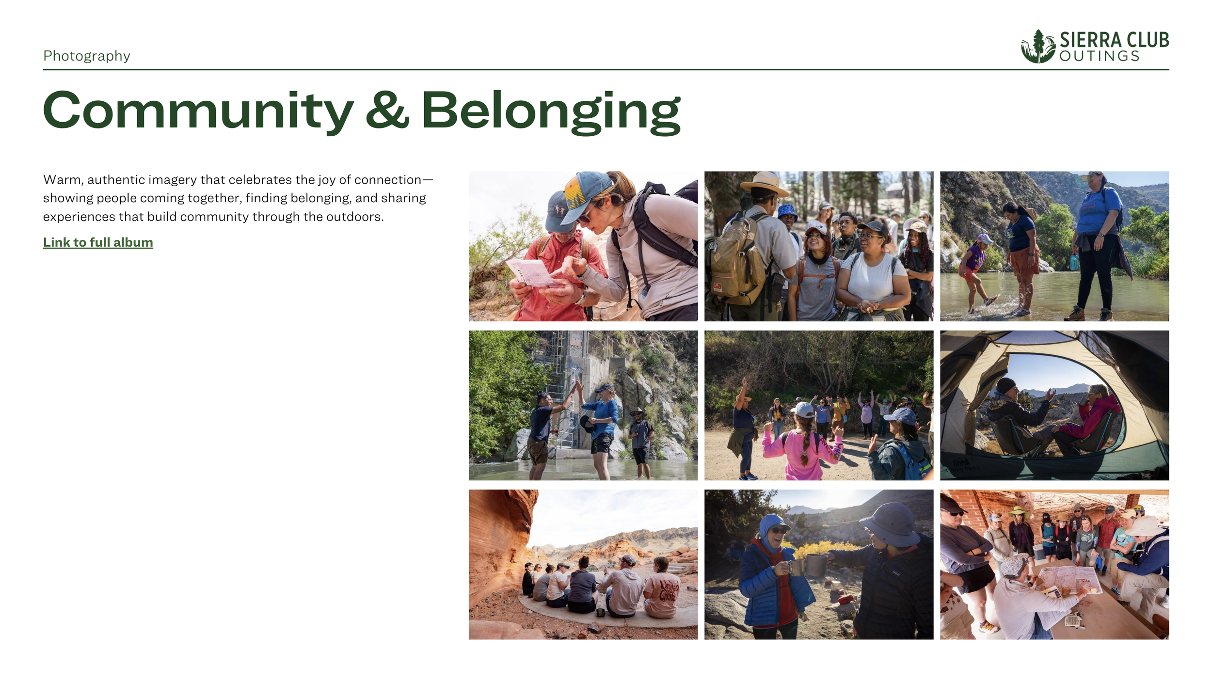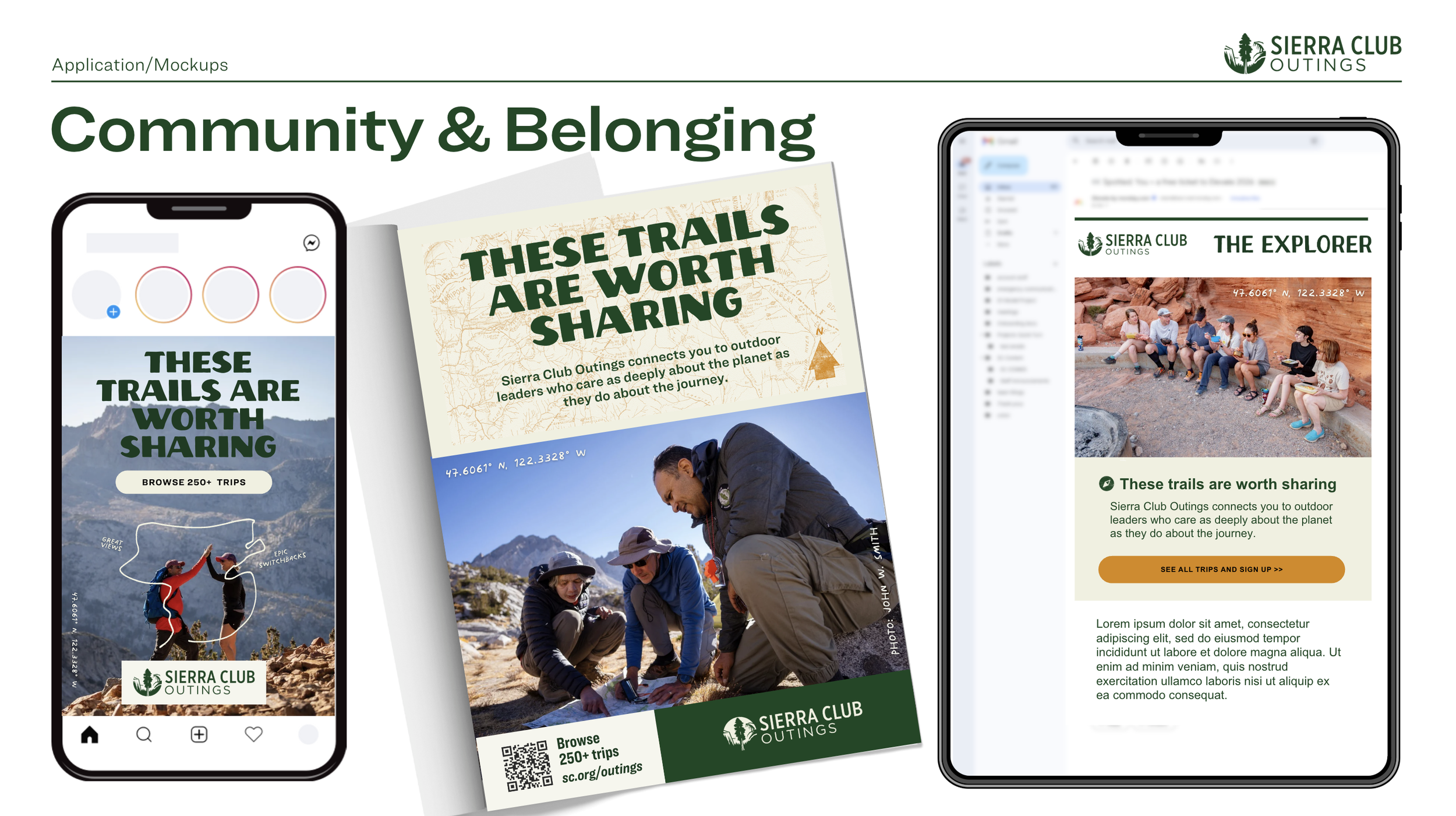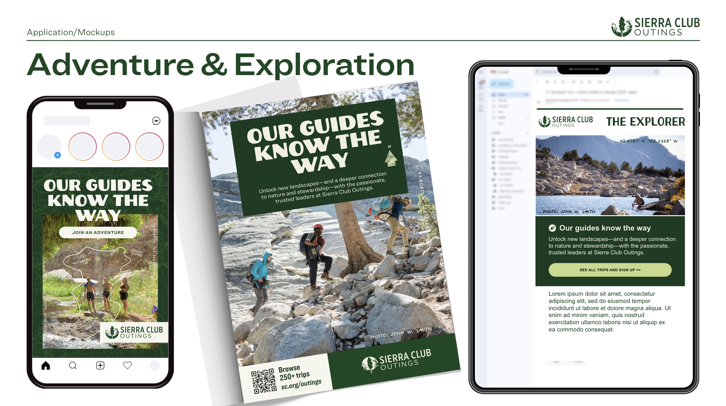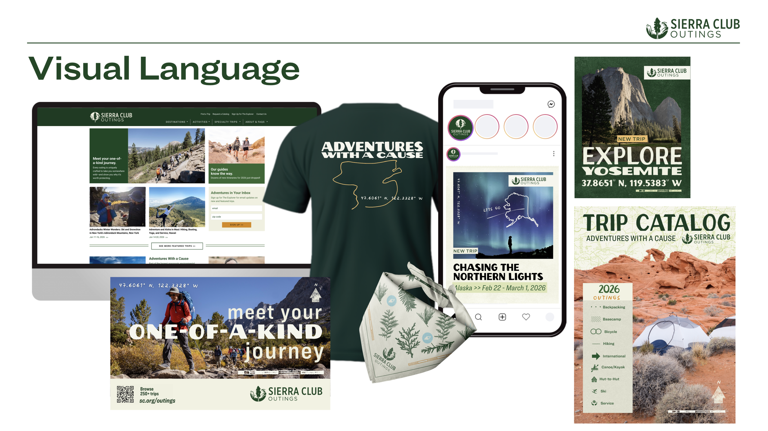 The messaging strategy provided the foundation for the practical systems that activate the Outings program. The visual direction extended the updated Sierra Club brand language and applied it through a focused lens shaped specifically for the Outings program goals and audiences.