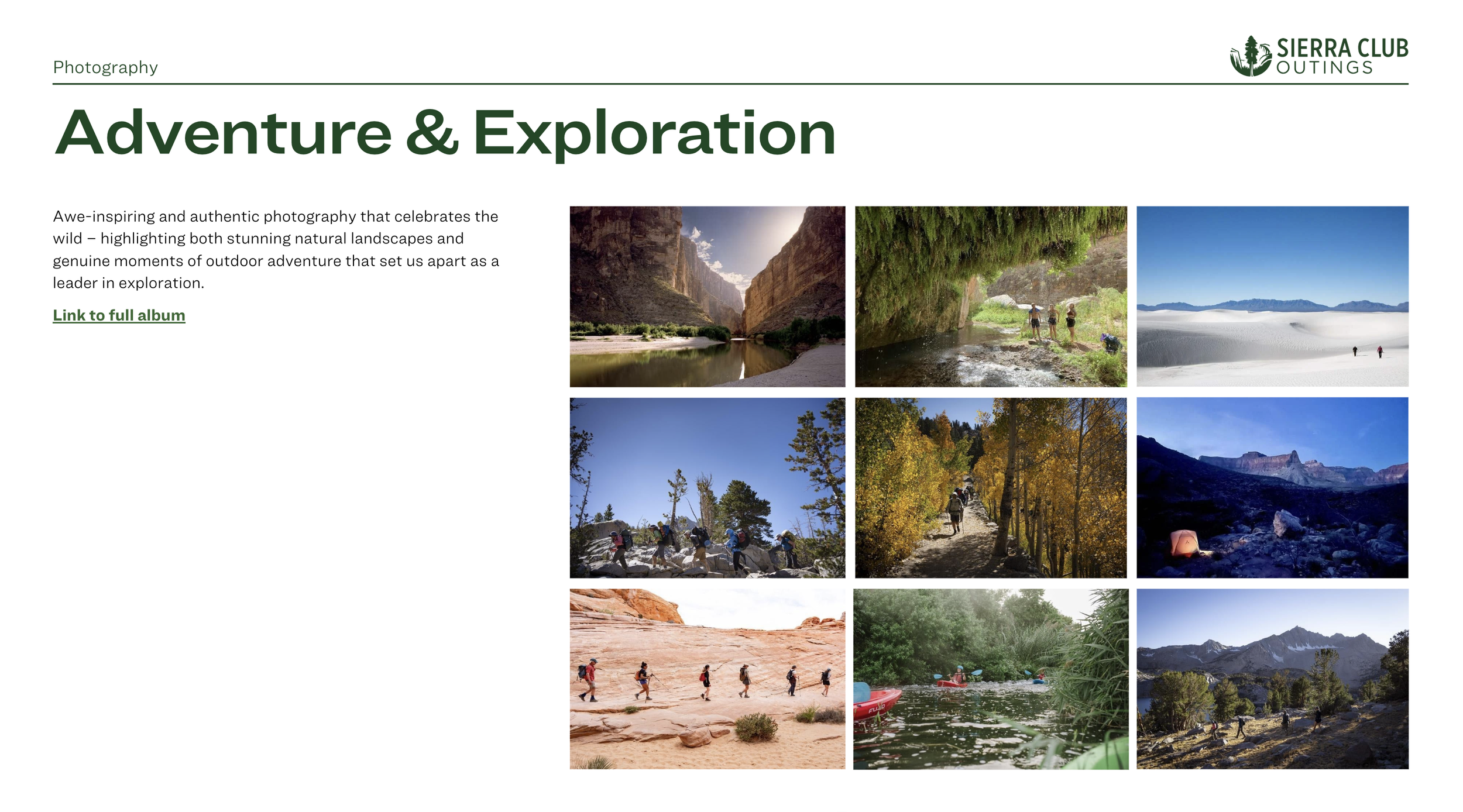 The Sierra Club Outings program — one of the nation’s oldest outdoor adventure outfitters — needed a modern, cohesive brand presence to stay competitive and diversify revenue in a shifting market. This work involved updating the program’s core messaging, marketing strategy, and creative tools to build a more compelling, aligned, and future-ready offering.